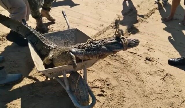 Na manhã desta sexta-feira na praia da Marina, na Armação, em Búzios. O jacaré surpreendeu os moradores da região ao surgir da água.