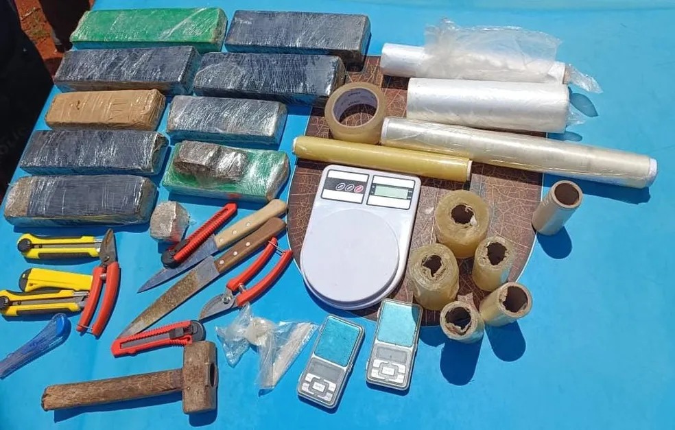 O suspeito não foi localizado. Entre o material apreendido estão dois alicates tesoura, duas facas, seis estiletes, uma marreta, dois rolos de sacola para embalar o material, oito rolos de filme plástico, uma fita adesiva, três balanças de precisão, nove tabletes de maconha e dois pedaços menores de maconha.