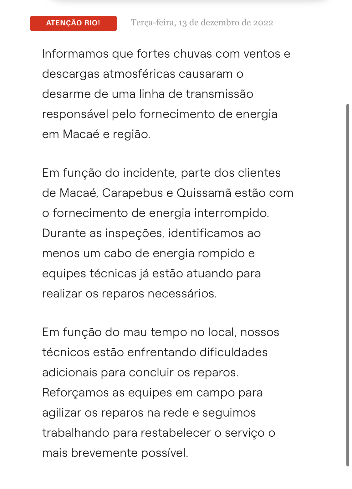 Ainda de acordo com a empresa, Carapebus e Quissamã também estão com abastecimento de luz interrompido. Entretanto, equipes técnicas já estão atuando para agilizar os reparos necessários para restabelecimento do serviço.