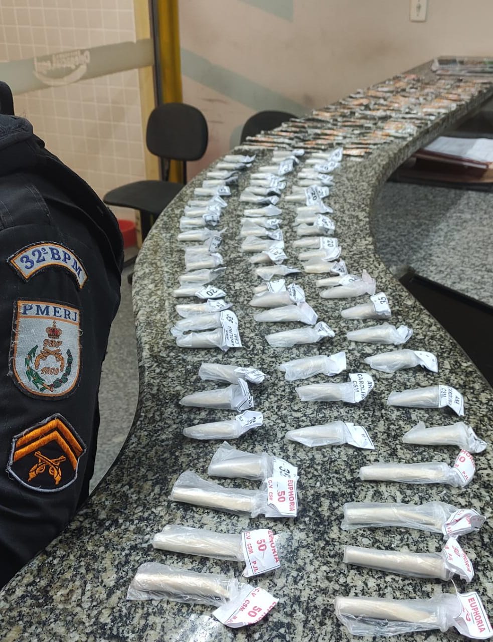 Em Casimiro de Abreu, a polícia prendeu Matheus Oliveira de Souza, vulgo “Sujinho”, após denúncia de que ele estaria com duas sacolas de drogas tentando enterrar em um terreno baldio, na localidade de Santa Ely.
