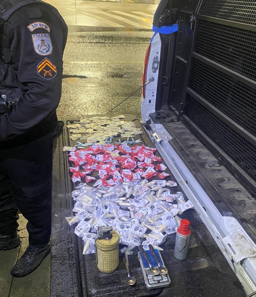 A Polícia Militar recebeu uma denúncia que informava que no bairro Lagomar, em Macaé, vários homens de uma facção criminosa estariam armazenando material ilícito. No local foi encontrado uma sacola contendo 310 papelotes de cocaína, 02 granadas, uma balança de precisão e 3 colheres. Todo material foi apreendido e levado para a 123ª DP.