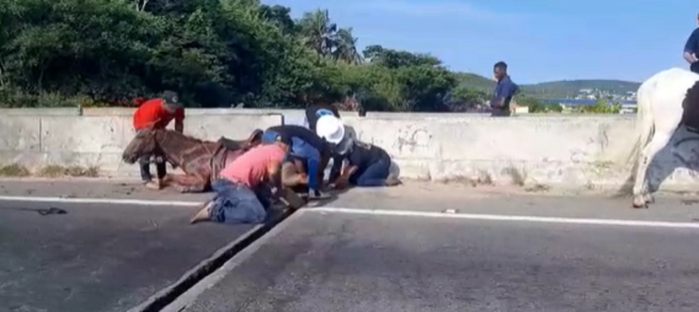 O incidente ocorreu por volta das 15h30, na Ponte Deputado Wilson Mendes, RJ-140, que liga as cidades de Cabo Frio e São Pedro da Aldeia, no sábado (25). Durante uma cavalgada, o cavalo ficou com a pata traseira presa em uma fenda da rodovia, entre duas placas de asfalto.