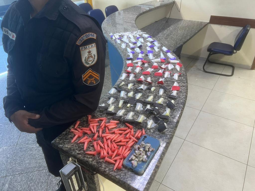 Durante patrulhamento intensificado nas localidades Âncora, Cláudio Ribeiro e Portelinha, em Rio das Ostras, a fim de coibir a prática de crime, agentes da Polícia Militar localizaram vários elementos praticando tráfico ilícito de drogas. Ao avistarem a viatura, os suspeitos fugiram. Na ocasião, um deles foi preso, e com ele foi encontrado 68 pinos, de R$ 10; 27 pinos, de R$ 20; 22 pinos, de R$ 35; 26 pinos, de R$ 50; 19 buchas de maconha, de R$ 5; além de 01 aparelho celular. O suspeito foi encaminhado para a 128ª DP, onde permaneceu preso.
