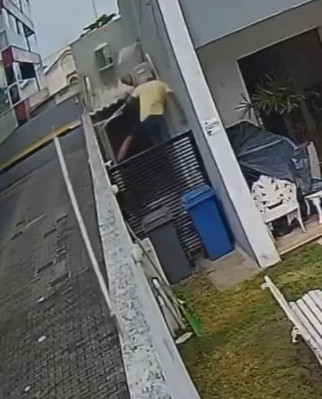 O jovem resolveu entrar no terreno de uma casa e pular o muro. Mas acabou se atrapalhando com a cerca elétrica, caindo no canil de um cachorro e por pouco não sendo mordido. Na segunda tentativa, ele conseguiu ultrapassar os obstáculos, para encontro dos PMs logo à frente.