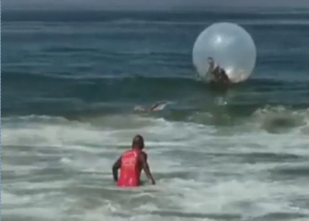 Foi necessário pedir ajuda dos salva-vidas, que resgatam as três vítimas rapidamente. O caso aconteceu na quarta-feira (19). Cabe ressaltar que a atração costuma ser realizada em águas rasas e com um terceiro participante que controla o item, já que quem está dentro não tem acesso ao externo. Apesar do susto, todos passam bem.