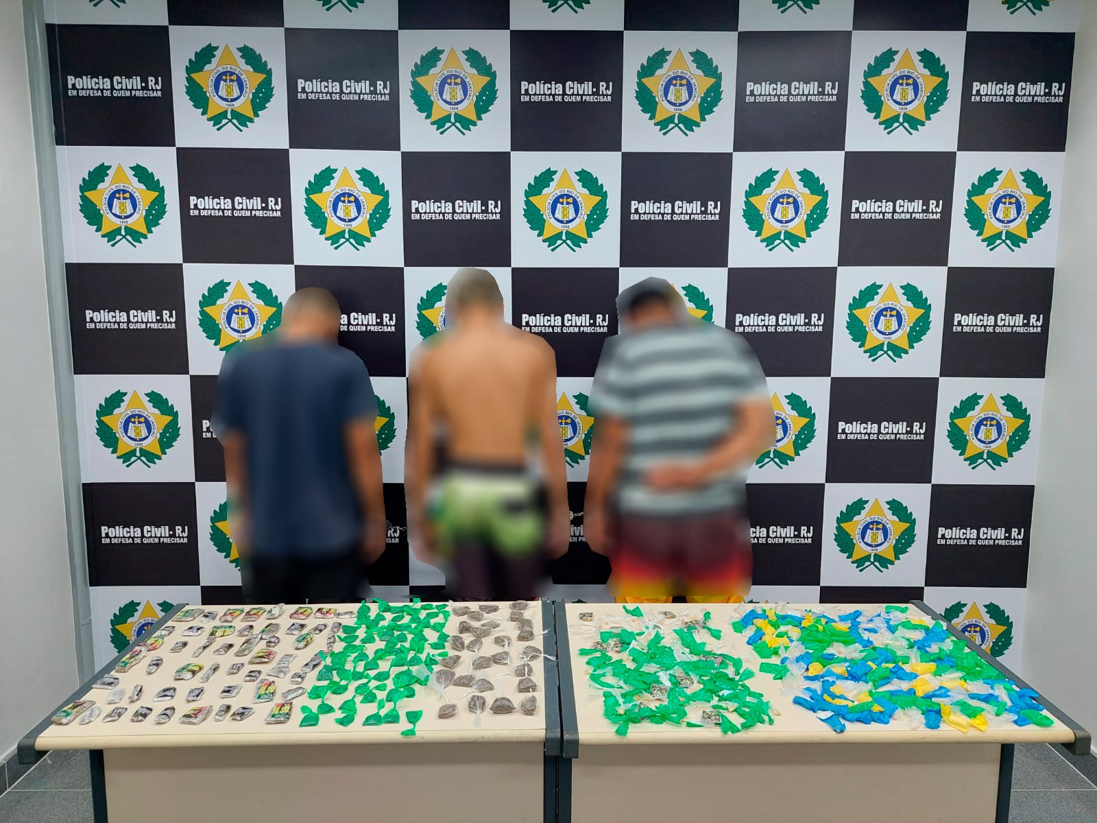 Em diligência ao endereço indicado, um cerco tático foi criado e os elementos, identificados pelas iniciais G.A.dos S. , F. M. da C. B. e J. P. O. de S.; presos em flagrante. Com eles foram apreendidos 126 sacolés de maconha, 215 sacolés de cocaína e 180 sacolés de crack.