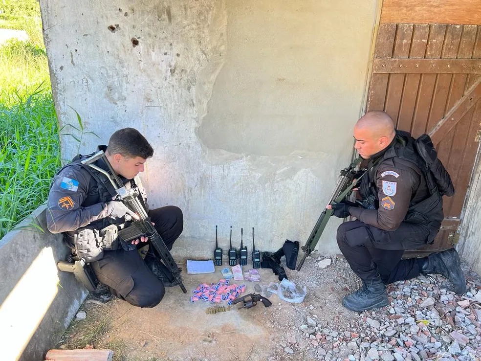 Com ele, foram encontrados um revólver, nove munições intactas, quatro rádios transmissores, drogas e um caderno com anotações do tráfico.