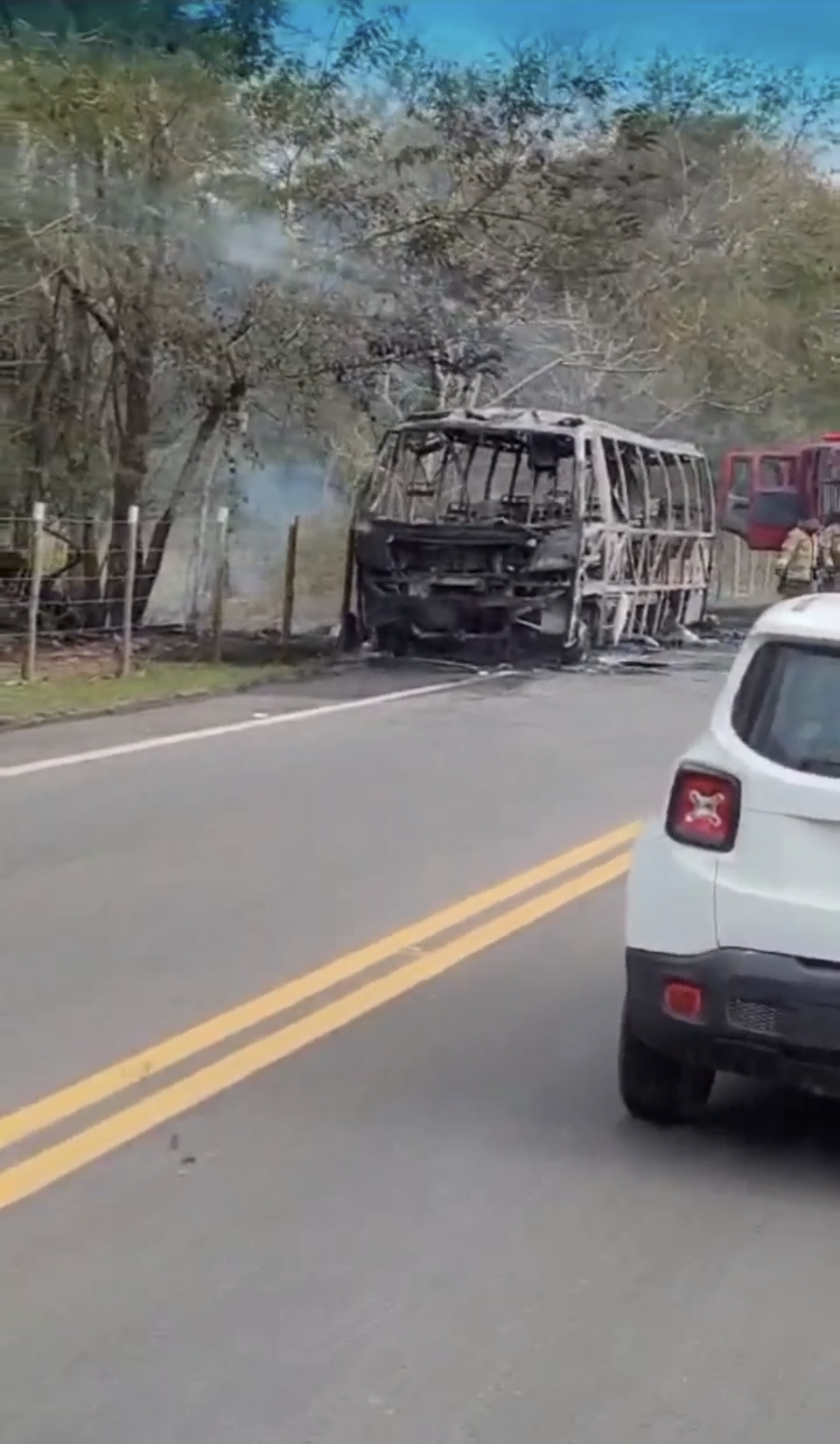 Vídeos compartilhados nas mídias sociais mostram o ônibus completamente destruído, bem como a atuação do Corpo de Bombeiros.