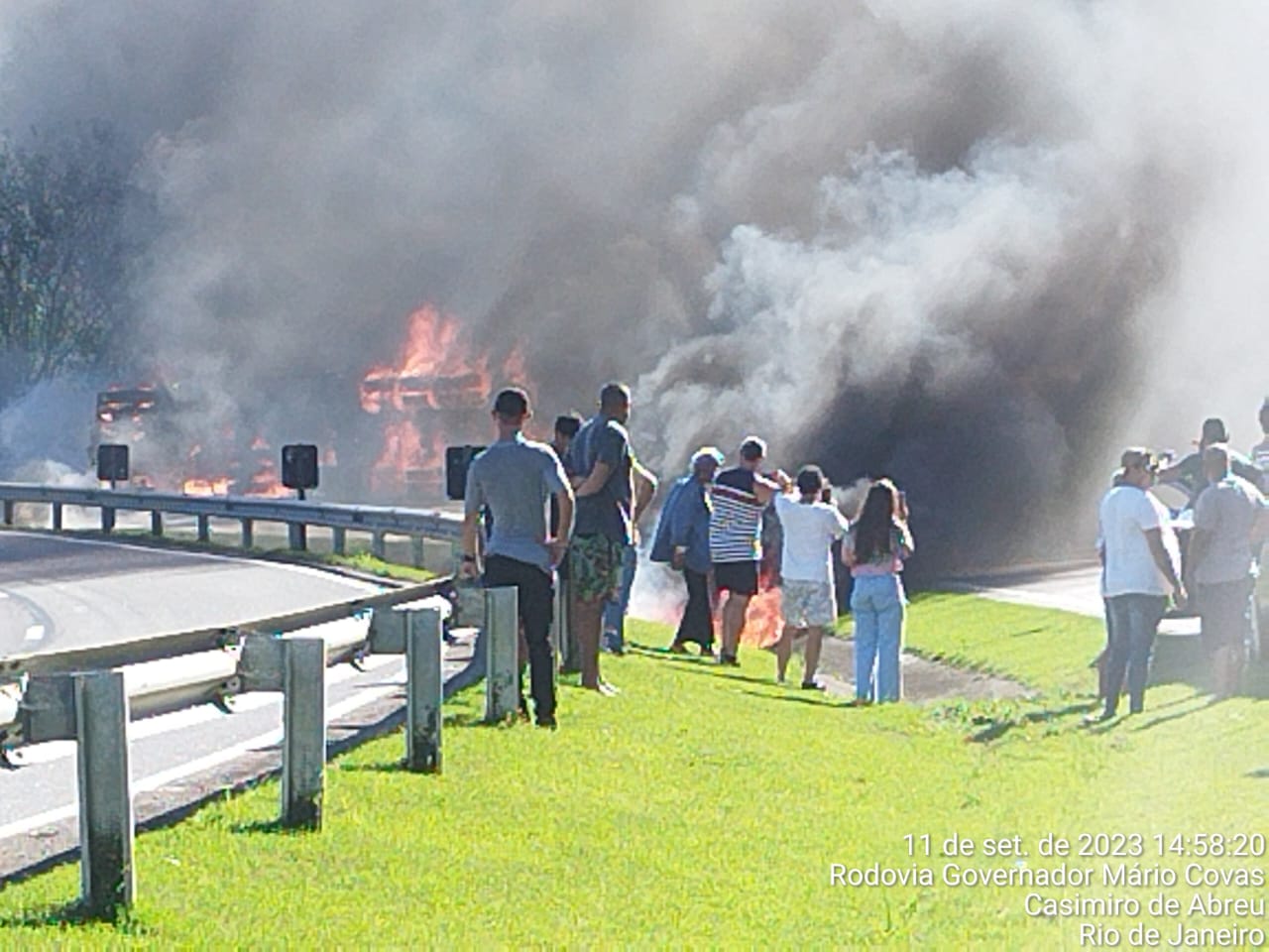 Um caminhão bi-trem, carregado com cerveja, tombou e pegou fogo, na tarde desta segunda-feira, 11, no km 209, em Casimiro de Abreu. A pista sul (sentido Niterói) está bloqueada no km 209, na região de Casimiro de Abreu, para atendimento à ocorrência envolvendo o tombamento seguido de incêndio de uma carreta bi-trem que transportava bebida alcoólica. As equipes do Copo de Bombeiros, Polícia Rodoviária Federal e da concessionária atuam no local. A ação inicial se concentrou no isolamento da área, atendimento à vítima e contenção do incêndio. Ainda não há previsão para liberação deste sentido da rodovia.