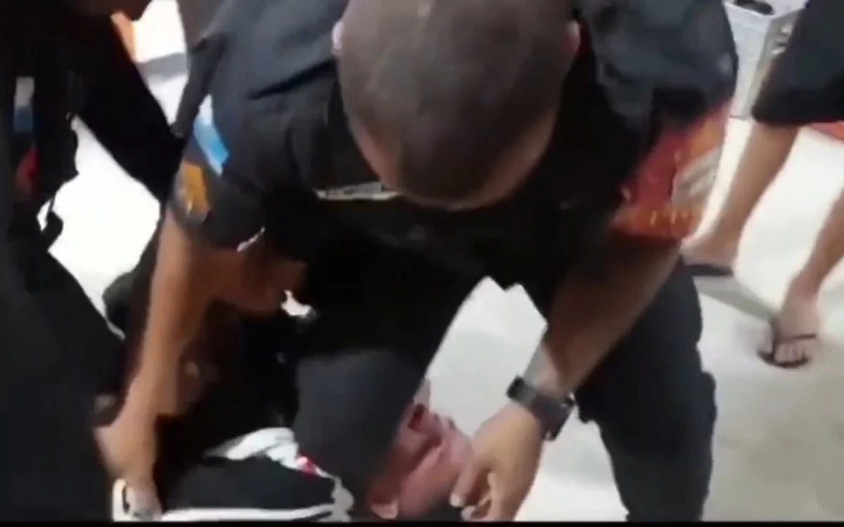 Uma gravação que circula pelas redes sociais mostra o agente dando tapas no rosto do homem, além de colocar o joelho no pescoço da pessoa, quando ela já estava imobilizada.