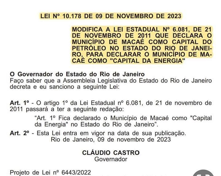 Macaé é oficialmente a Capital da Energia. É o que prevê a Lei Nº 10.178, sancionada pelo governador Cláudio Castro e publicada nessa quinta-feira, 09. A nova Lei modifica a Lei Estadual Nº 6.081, De 21 de novembro de 2011, que declara o município de Macaé como Capital do Petróleo, para declarar agora como Capital da Energia no Estado do Rio de Janeiro.