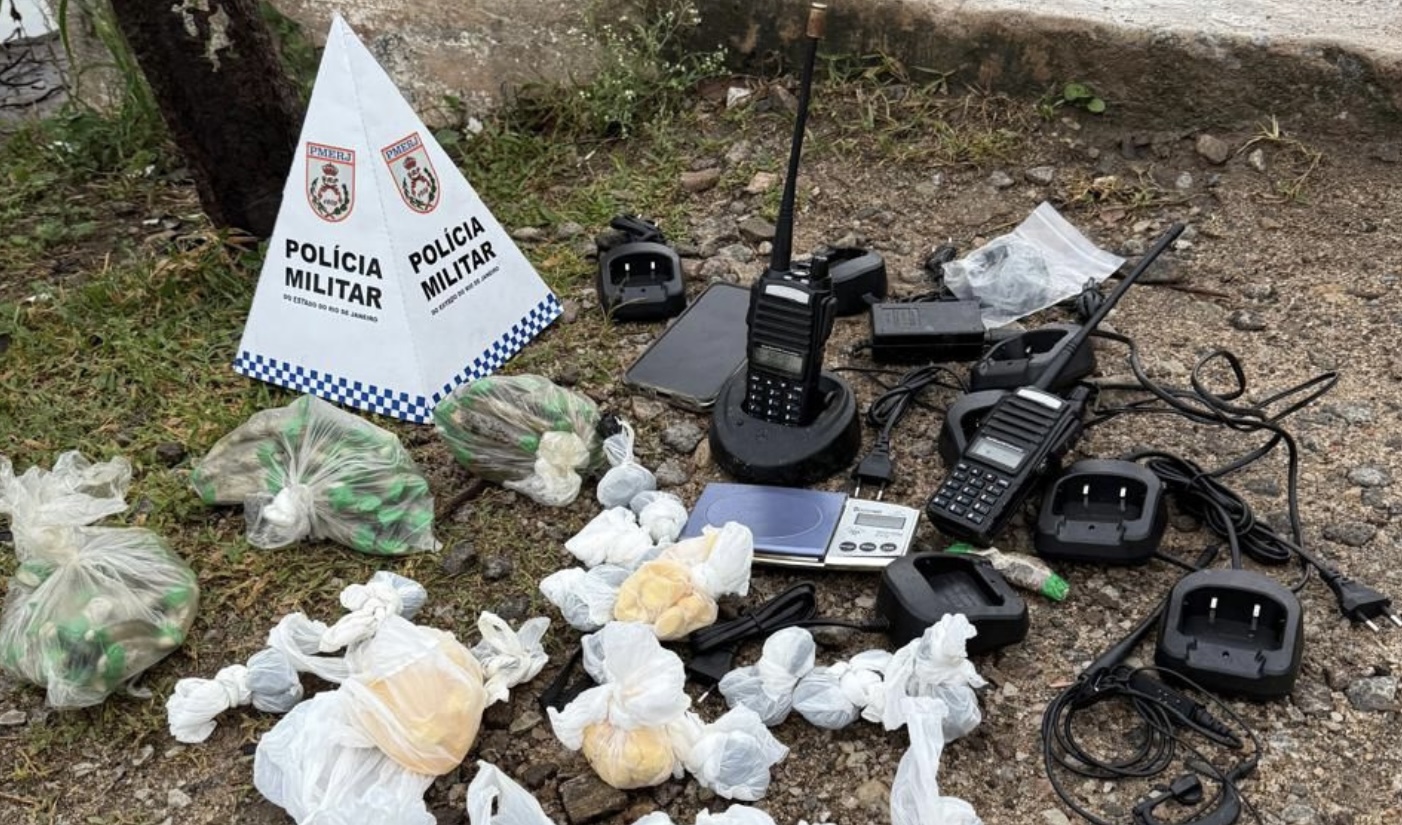 Na área conhecida como “Burro de Cimento”, outros dois homens foram flagrados tentando fugir. Com eles, a polícia apreendeu dois rádios comunicadores, 275 papelotes de cocaína, 104 porções de maconha, uma balança de precisão, um celular e nove bases de carregadores de rádio. Um dos presos tinha mandado de prisão em aberto por tráfico e associação para o tráfico.
