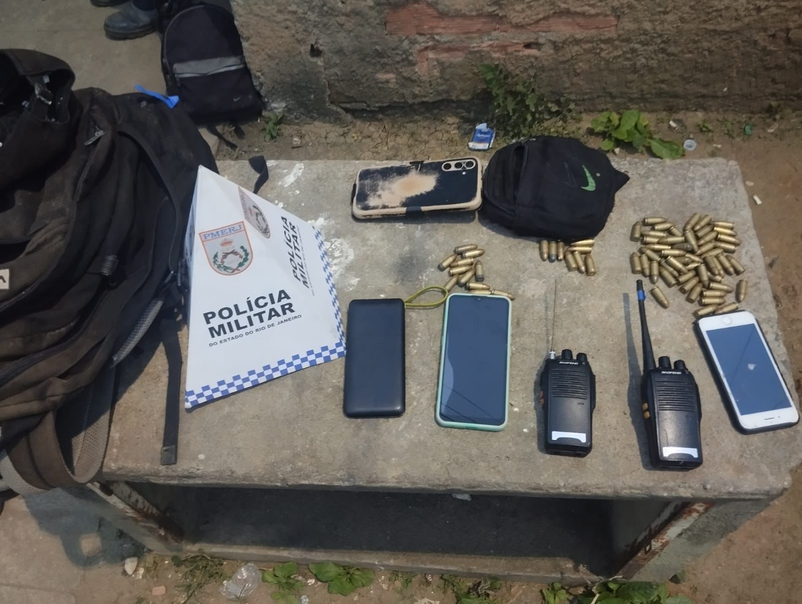 Na abordagem, os militares apreenderam 70 munições de calibre 9mm, dois rádios transmissores, três celulares, duas baterias portáteis, roupas camufladas e R$ 3 em dinheiro. Parte do material estava distribuída entre os detidos.