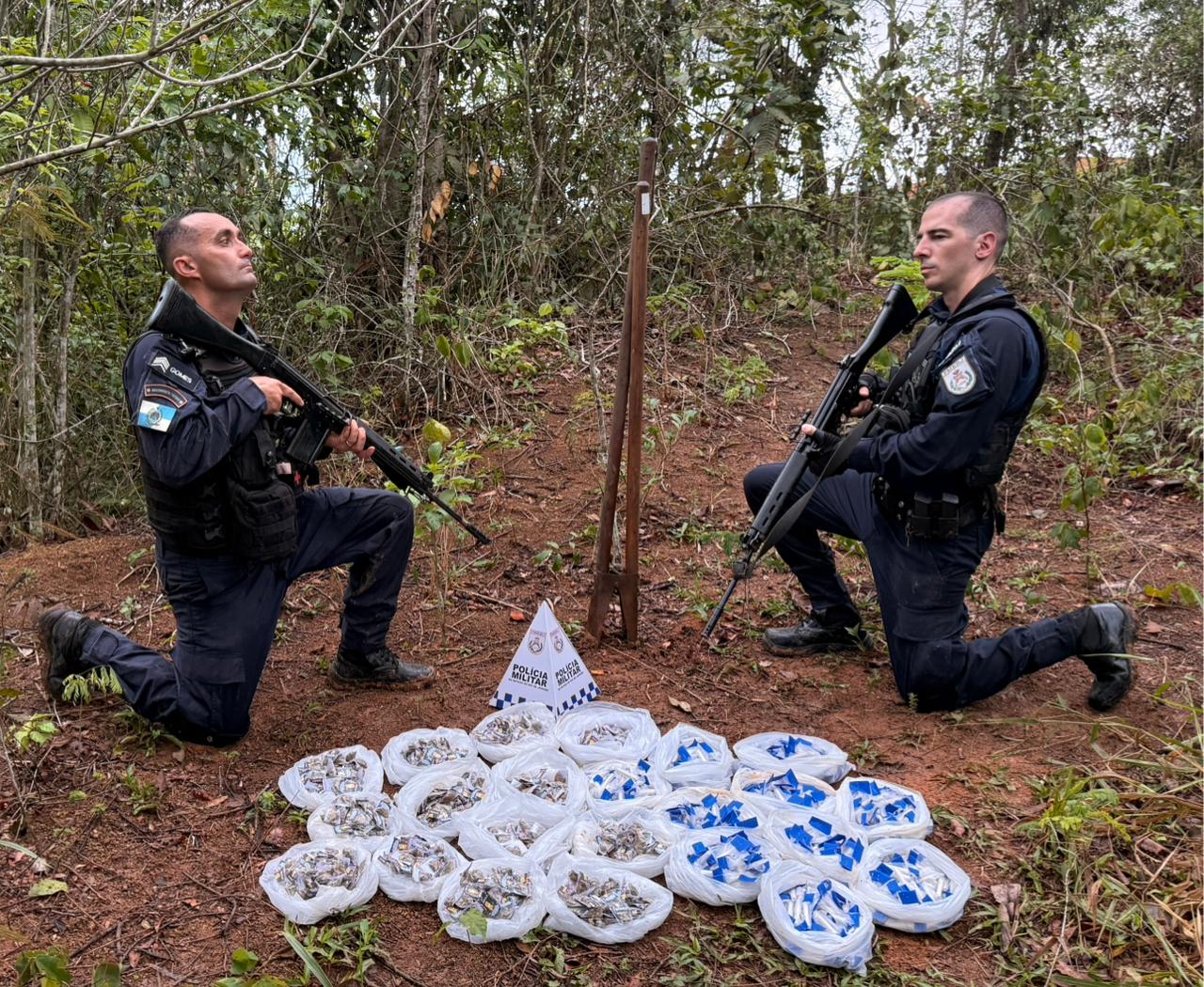 Durante varredura em uma área de mata, os agentes localizaram um tonel enterrado, utilizado como esconderijo de drogas prontas para a comercialização. No interior do recipiente foram encontrados 622 invólucros de skank, totalizando aproximadamente 4,2 quilos, além de 750 pinos de cocaína, que somaram cerca de 2,8 quilos.