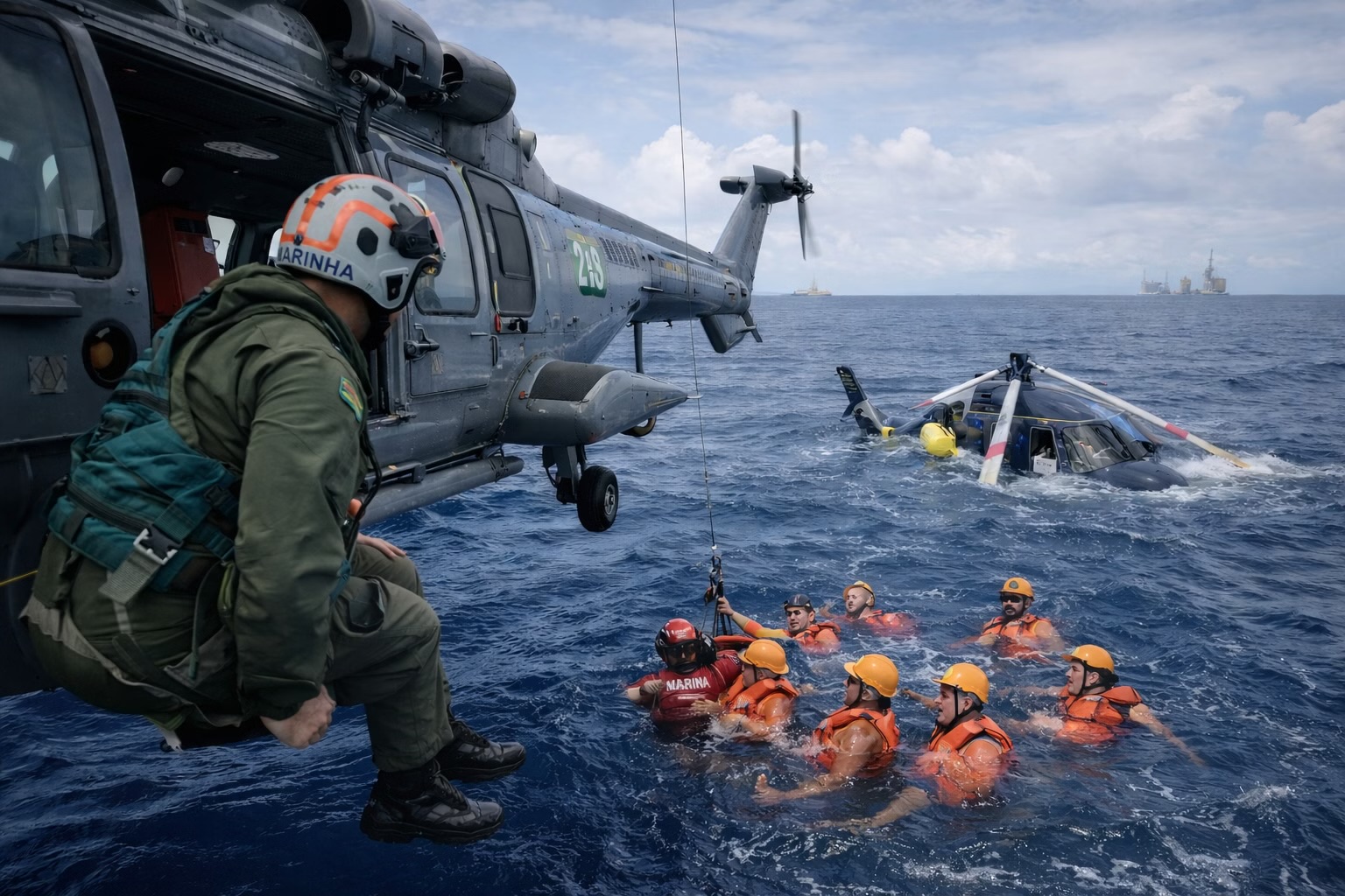 Oito pessoas foram resgatadas no mar, a cerca de 74km ao sul de Cabo Frio, pela Marinha do Brasil depois que um helicóptero precisou fazer um pouso forçado nesta sexta-feira (2). Todas estavam conscientes e não houve registro de feridos.