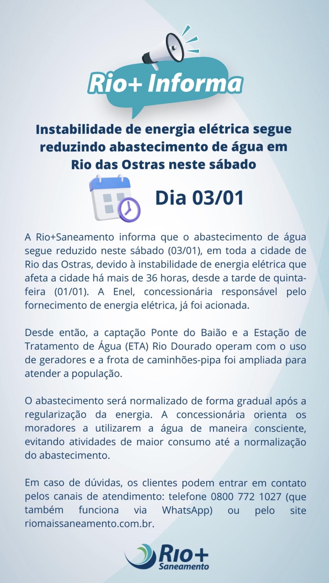 Enquanto a situação não é normalizada, a captação Ponte do Baião e a Estação de Tratamento de Água de Rio Dourado seguem operando com geradores. A frota de caminhões-pipa também foi ampliada para auxiliar o atendimento à população.