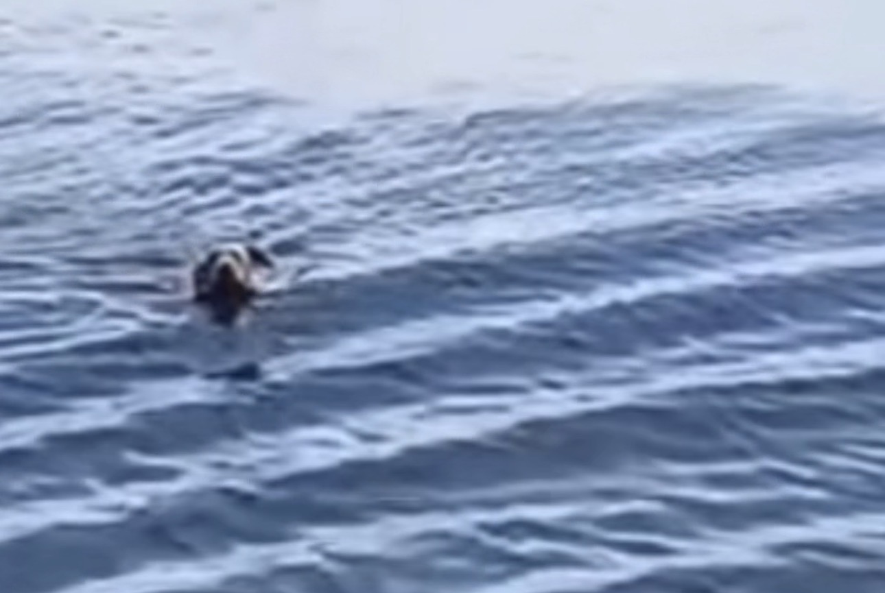 Um cachorro foi visto nadando sozinho, já distante da faixa de areia, nas proximidades da Ilha Feia. Cansado, mas ainda tentando se manter, ele seguia sem direção.