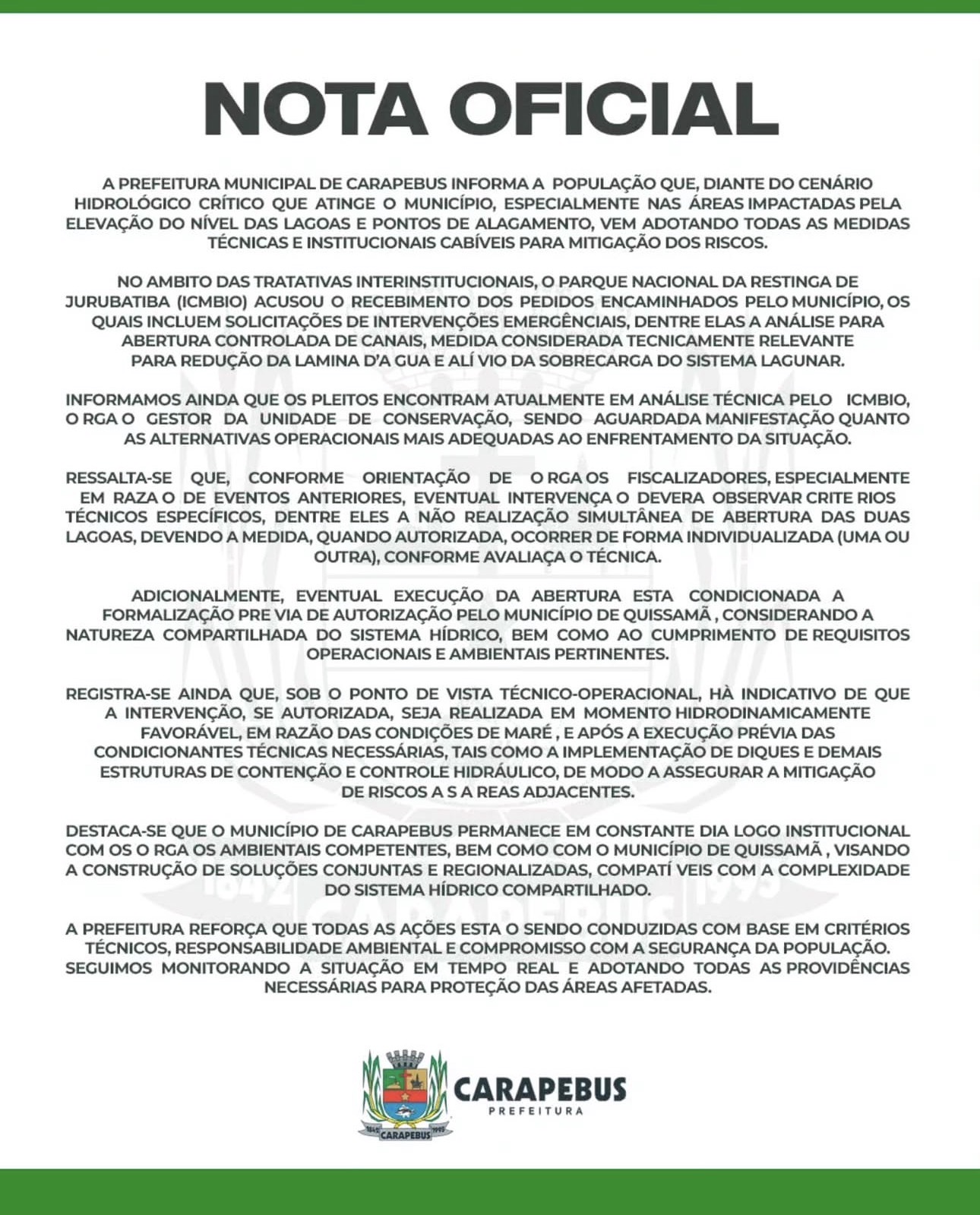 Em nota, o município afirmou que vive um cenário hidrológico crítico, com lagoas cheias e áreas alagadas. Os pedidos de intervenção, como abertura de canais, estão em análise e precisam seguir critérios técnicos e ambientais, além de autorização de órgãos responsáveis.